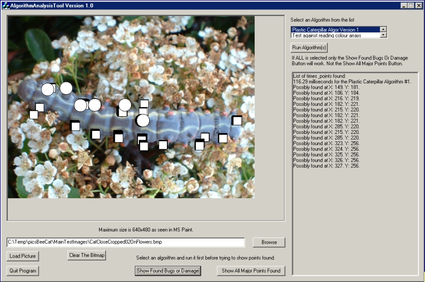 My algorithm tester for primitive "vision algorithms". To provide a robot with coordinates of where to pick up an insect. This tool also times the algorithms and thus allows me to see how efficient they are. Not the best of algorithms but at least it introduced me to the topic and allowed me to learn a little more about image processing.