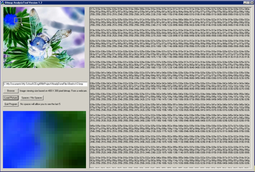 After using this bitmap analysis tool for a while I've decided that I will be altering it to show less values and make the picture and blow up window bigger. Presently the area for numbers is 29 by 20 pixels. I think I'm going to reduce it to 16 by 10. And eventually a scrollable area for the picture. So, that larger images can be looked at. Please click on the image below to enlarge.